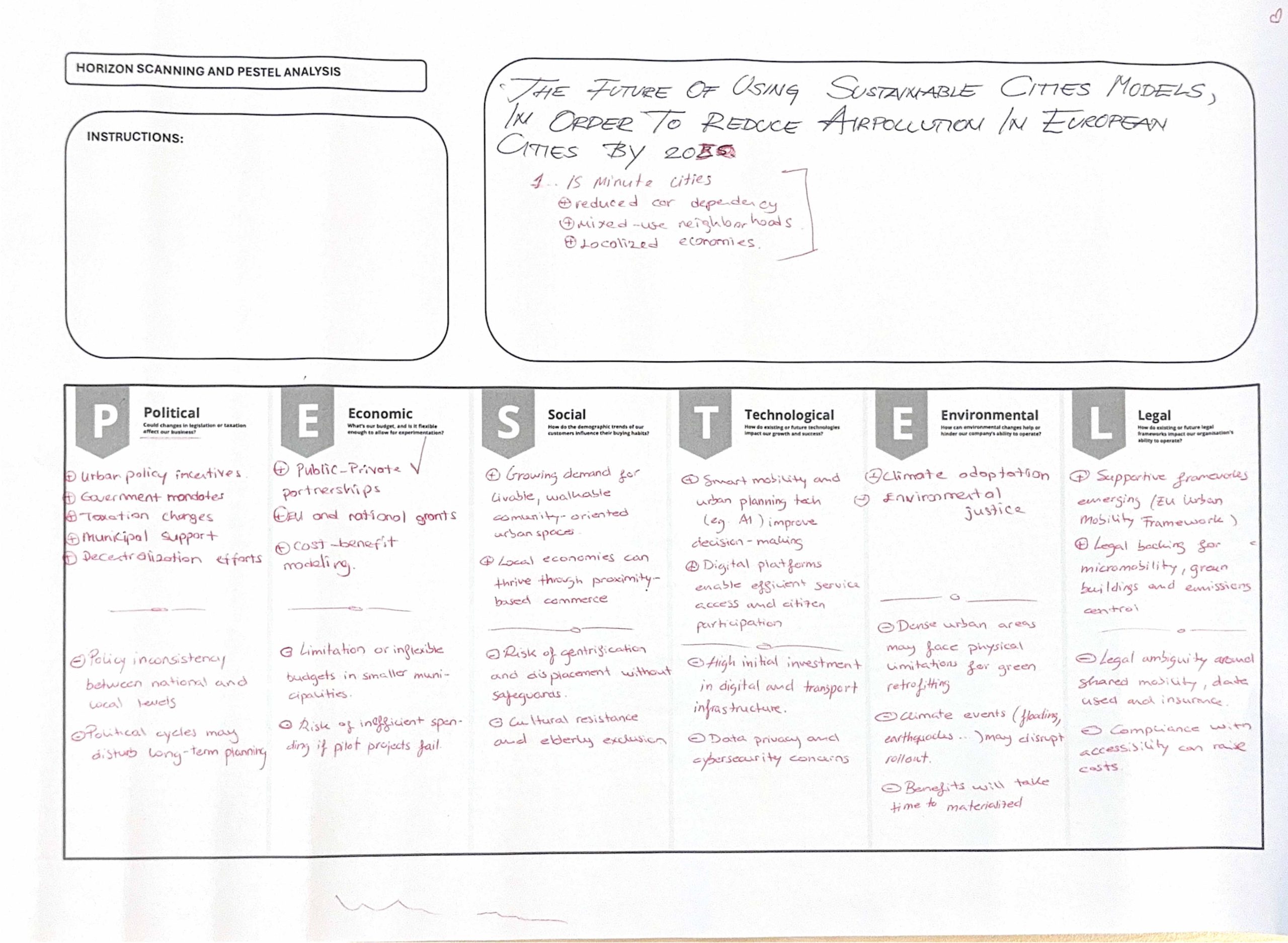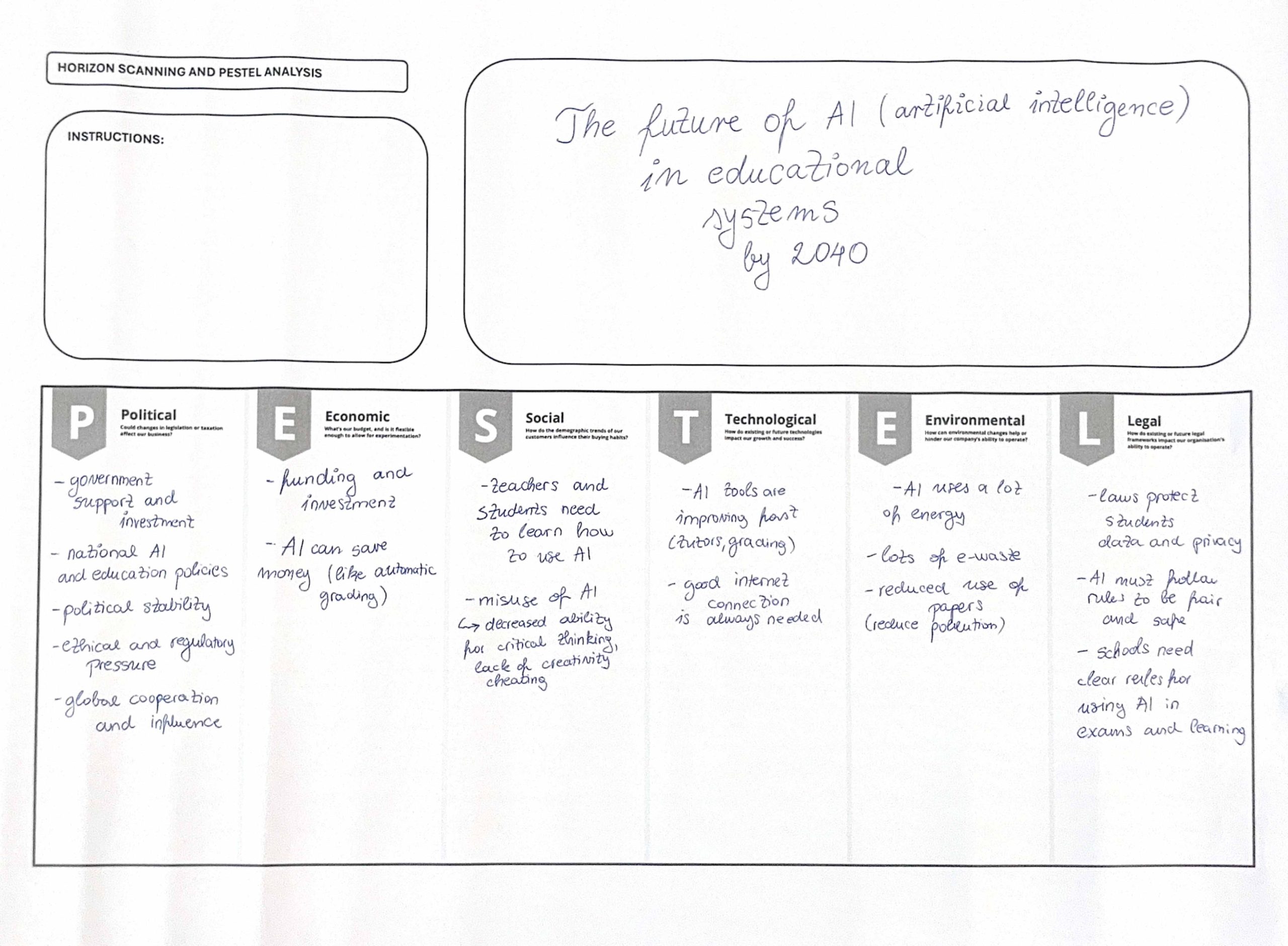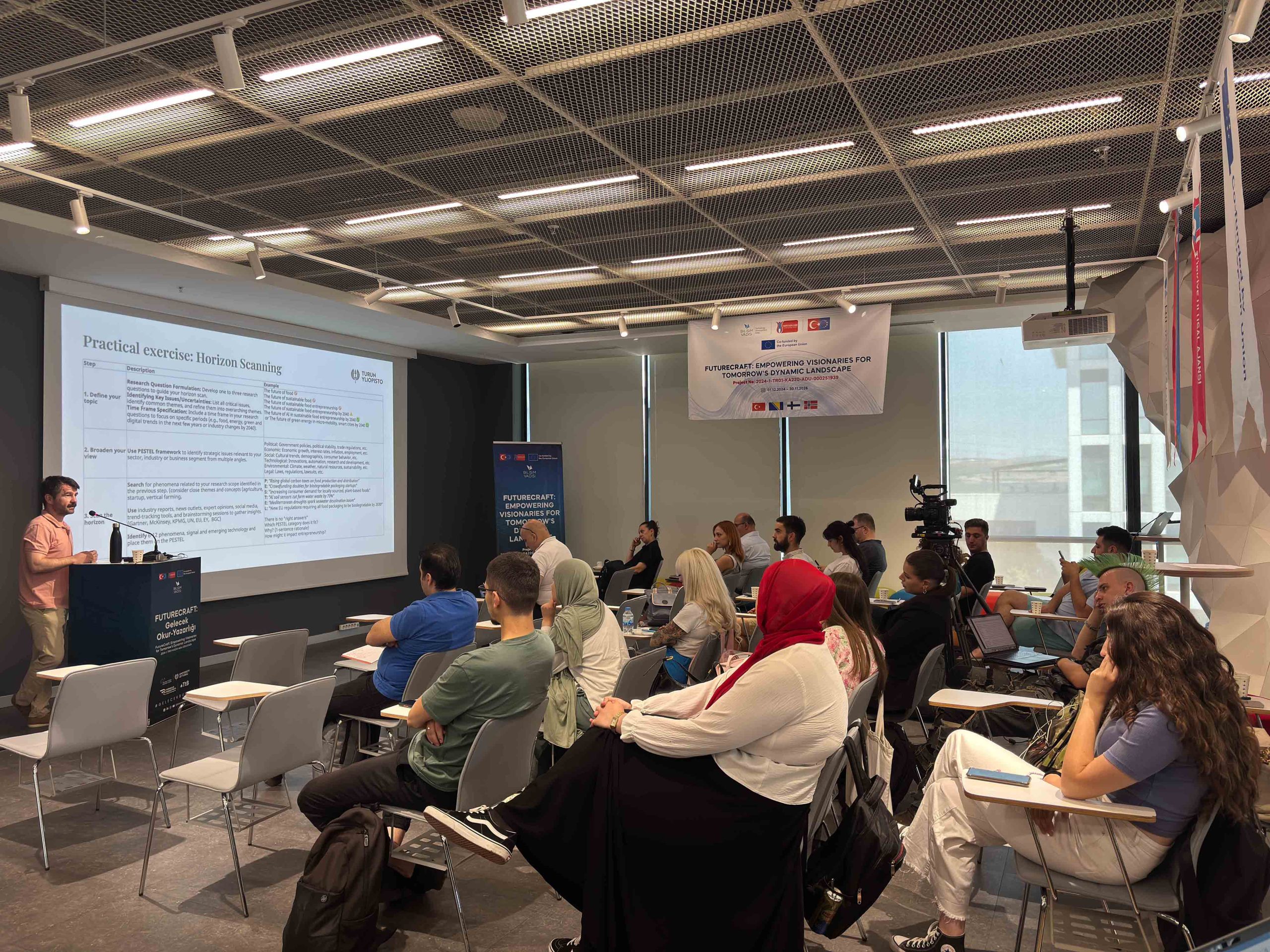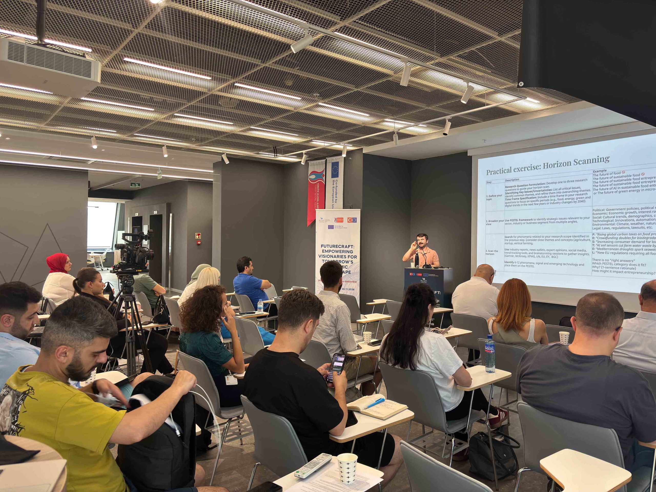 Atölye çalışması bölümünde, katılımcıların mevcut bilişsel kapasitelerini ölçmek üzere Gelecek Bilinci ön testi uygulanmıştır. Ardından Ufuk Taraması (Horizon Scanning) yöntemi tanıtılarak megatrendler, trendler ve zayıf sinyallerin nasıl tespit edildiği aktarılmıştır. PESTEL çerçevesi kullanılarak katılımcılar, seçilen temalar üzerinden çevresel tarama yapmış ve değişim sinyallerini sistematik biçimde analiz etme pratiği kazanmıştır.