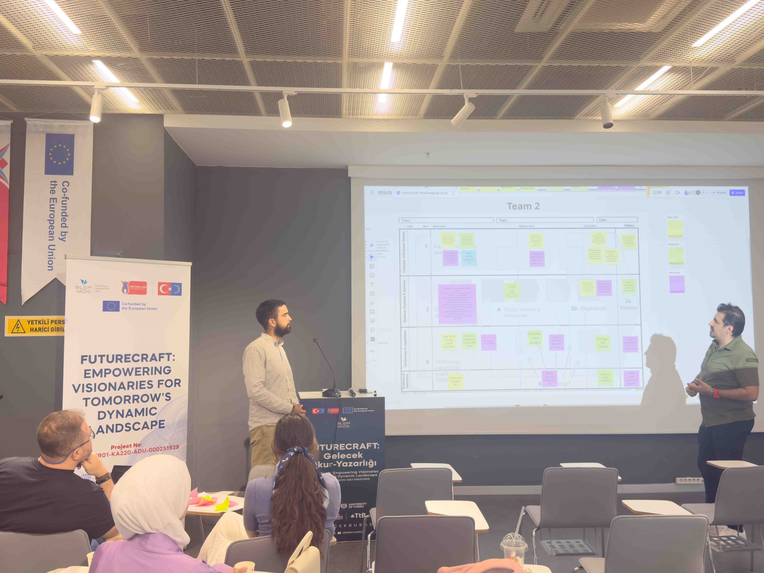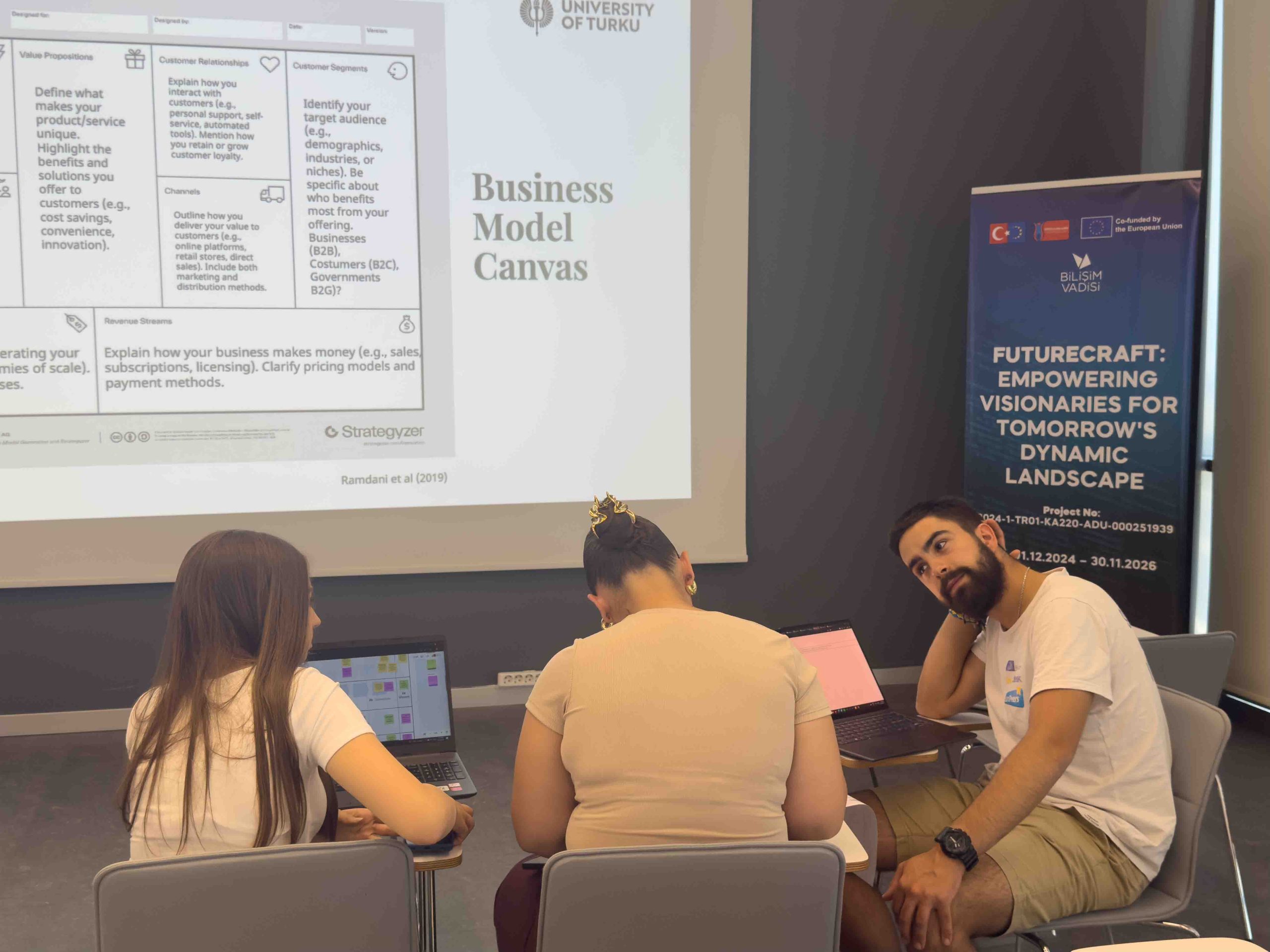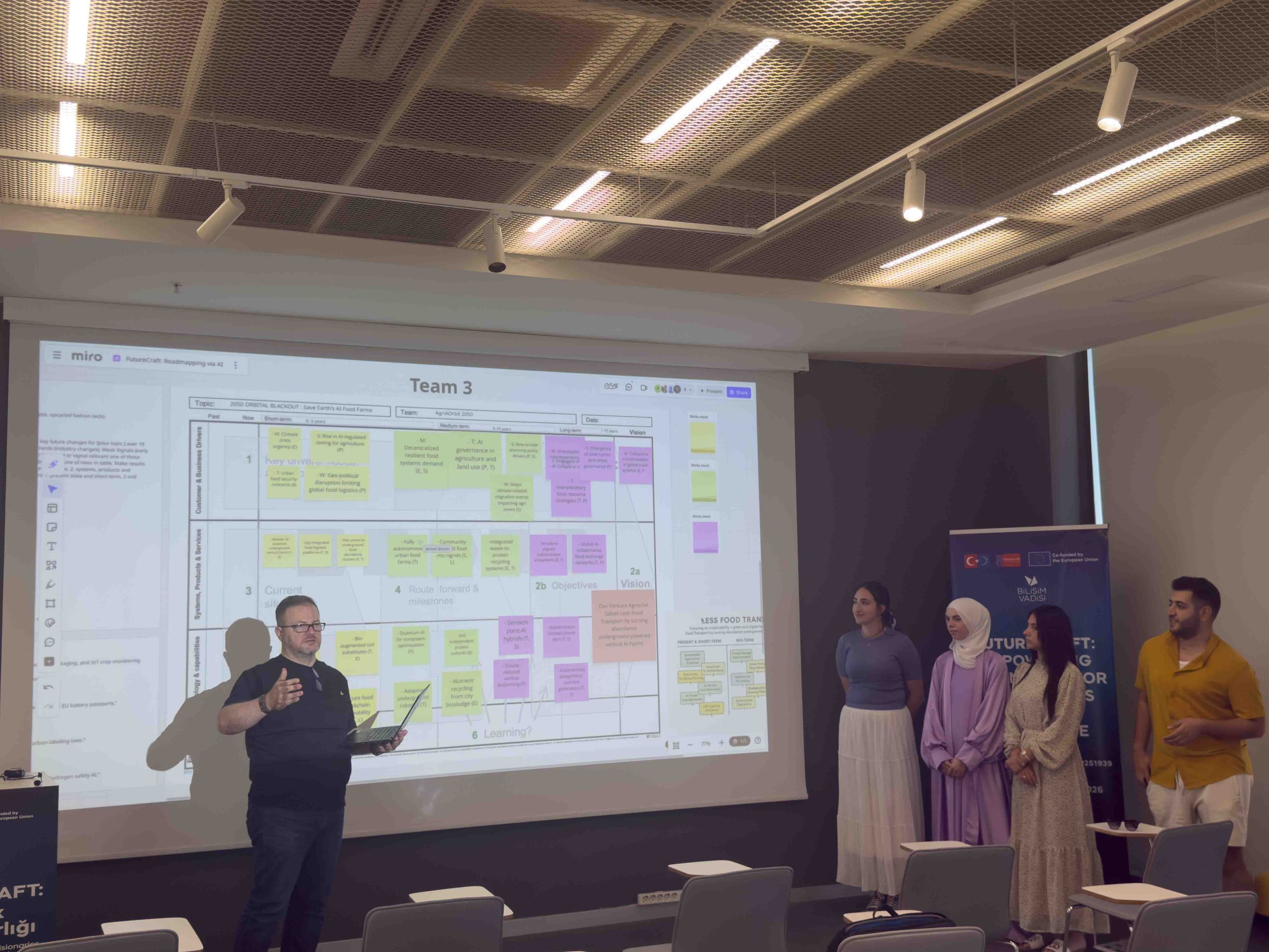 Eğitmenler, eğitimin yapılandırılmış bir kapanışını gerçekleştirmiştir. Katılımcılar Futures Consciousness son testini tamamlamış ve program süresince geliştirdikleri, stratejik öngörüyle bütünleşik uyarlanabilir iş modeli prototiplerini sunmuştur. Gün, öğrenme çıktıları ve sonraki adımlara ilişkin kapanış değerlendirmeleriyle sona ermiştir.